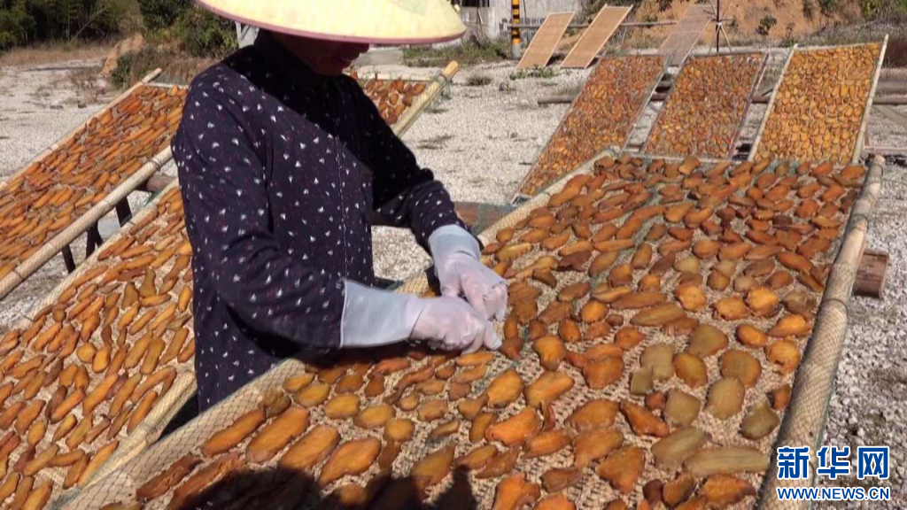 番薯蒸好出锅后,村民们会将番薯均匀切片,整齐地码放在篾帘上晾晒,期间还要根据晾晒程度多次翻面。