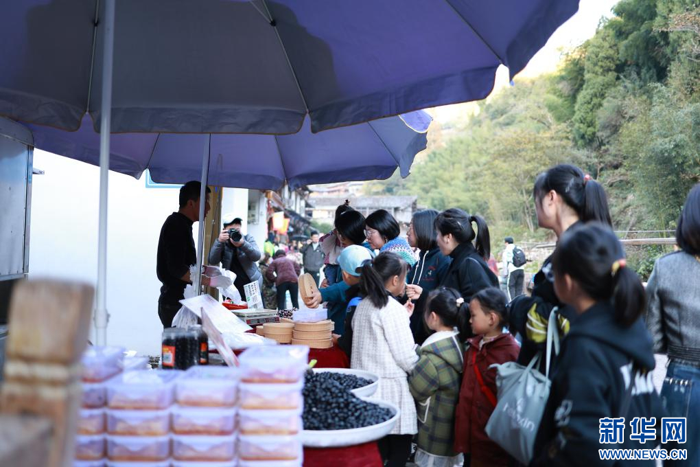 摊位前,不少游客正在询问农副产品的价格。“游客多的时候每天可以卖两三千元。”村民毛守珍说,她提前半年就开始备货,制作彩色素面、柿子干、番薯枣等。