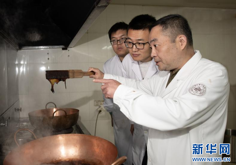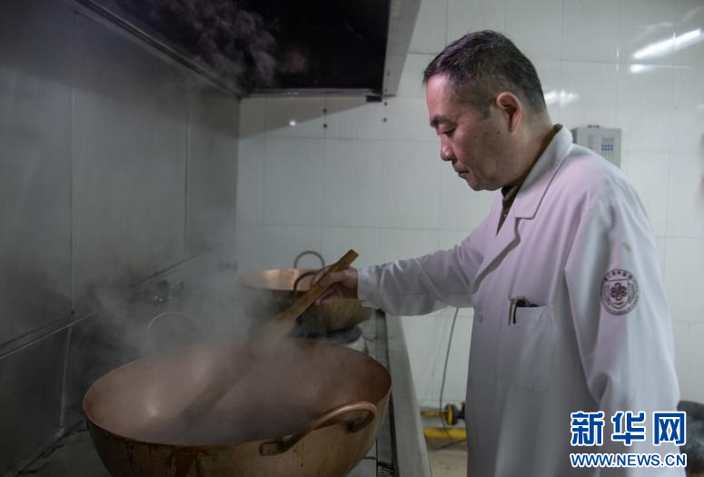 钱国良老药工在用铜锅熬制膏方。新华网发(浙江省中医院 供图)