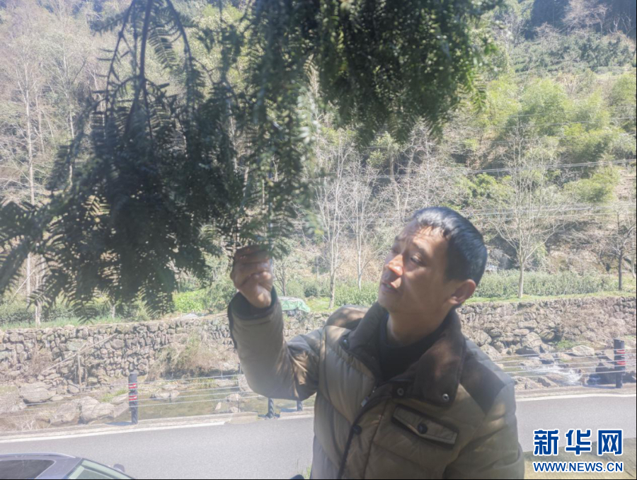 宣鑫灿查看古香榧树的情况。新华网发 张灵杰 摄