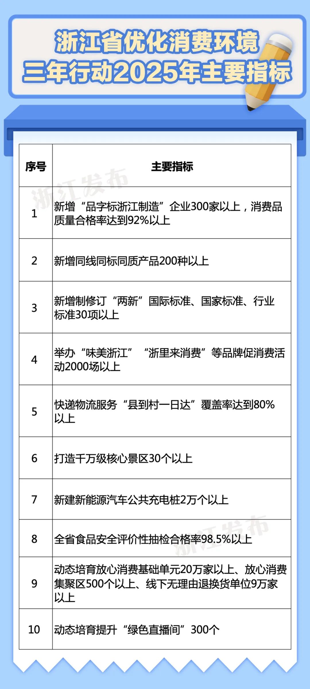 2025年,浙江要以实施消费供给提质、消费秩序优化、消费维权提效、消费环境共治、消费环境引领等五大行动为牵引,推动商品服务质量提升,消费风险降低,消费纠纷源头化解效果明显,经营者诚信意识不断增强,全省消费环境持续优化,力争消费环境指数位居全国第一方阵。