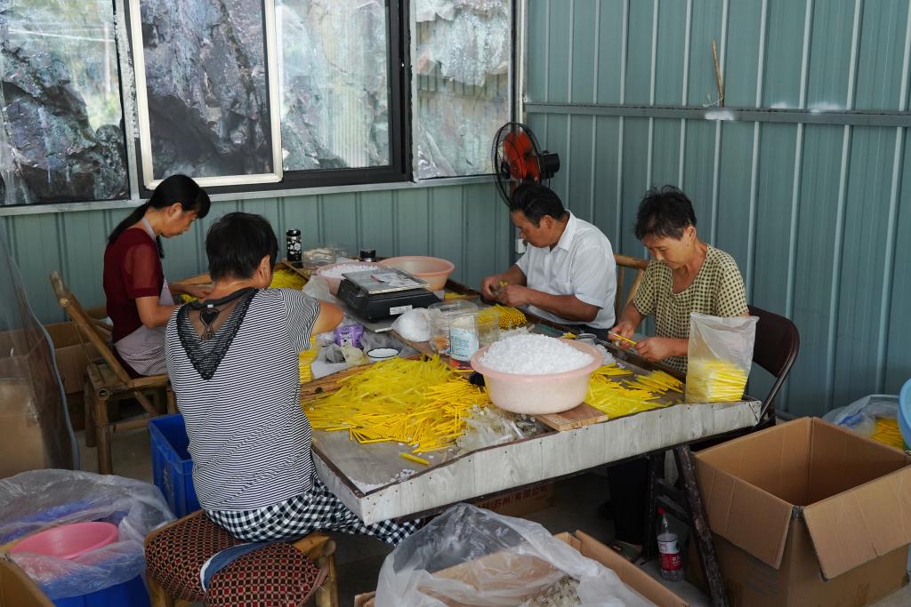 分水镇大路村的套笔站内,不少老人正专注地进行着套笔作业。“我一天能套6000多支笔,算下来能挣到将近一百块!”70多岁的刘奶奶是这家套笔站的熟练工,指尖翻飞间,一支支笔芯与笔杆迅速“合体”。