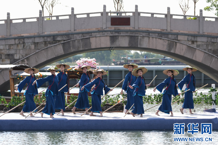 10月24日,浙江歌舞剧院演员在新市古镇表演舞蹈《富春》。