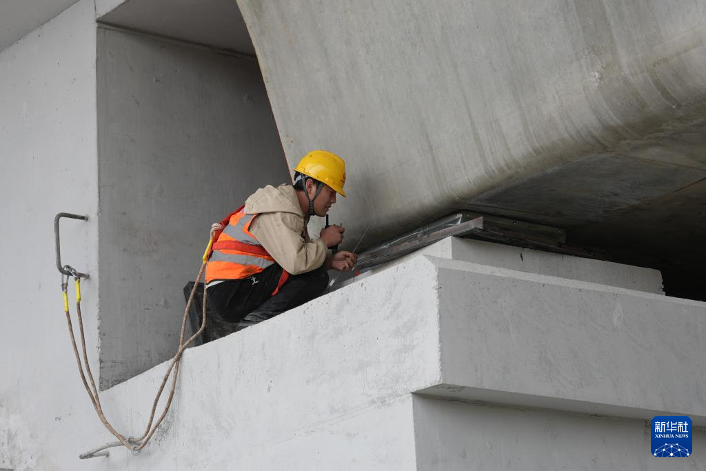10月28日,中铁四局工程技术人员在甬舟铁路首榀箱梁架设现场确保架梁作业精度和安全。