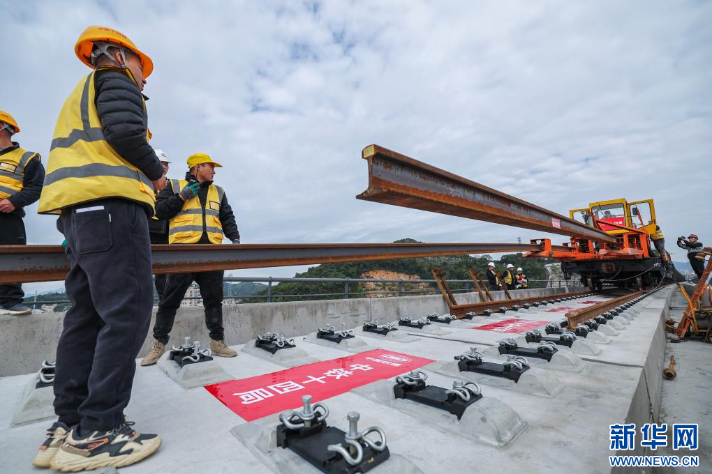 11月5日,在浙江省台州市杭台高铁温岭至玉环段施工作业现场,中铁十四局工作人员操作长轨牵引车将首段500米长钢轨精准铺设在无砟道床上。