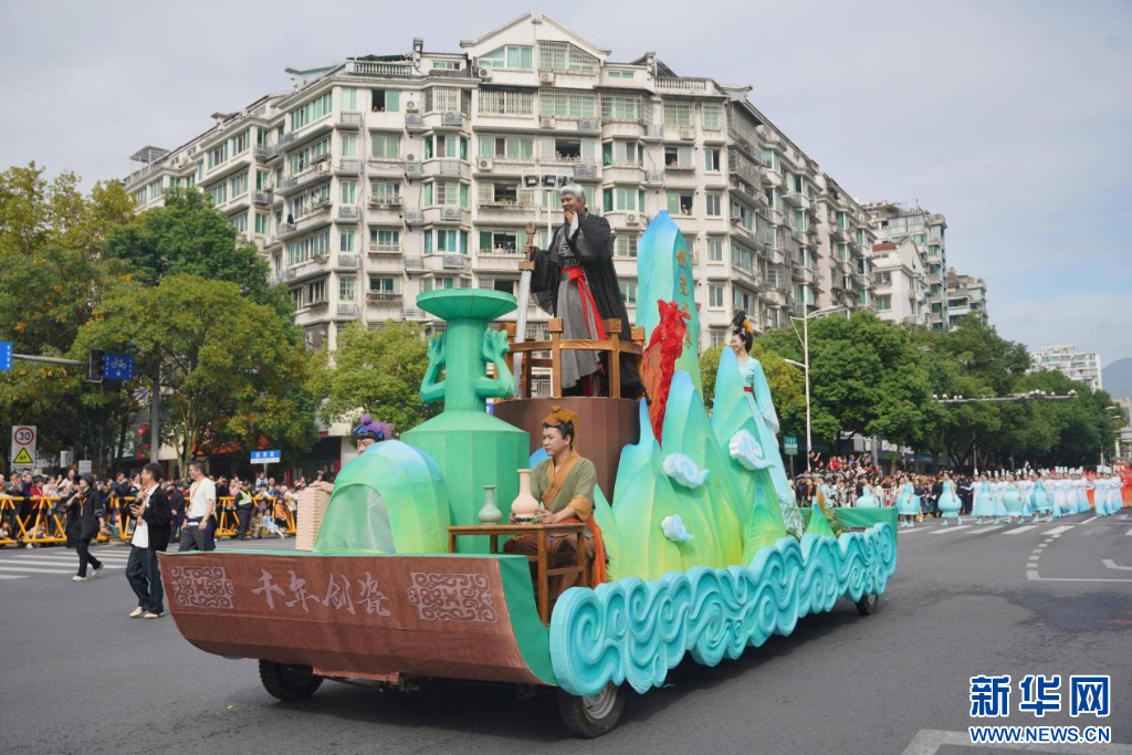 11月8日,在丽水市主城区巡游现场,龙泉方阵再现青瓷拉坯与宝剑锻造,展示千年“剑瓷”技艺的匠心传承。新华网发 丽水市新闻传媒中心供图