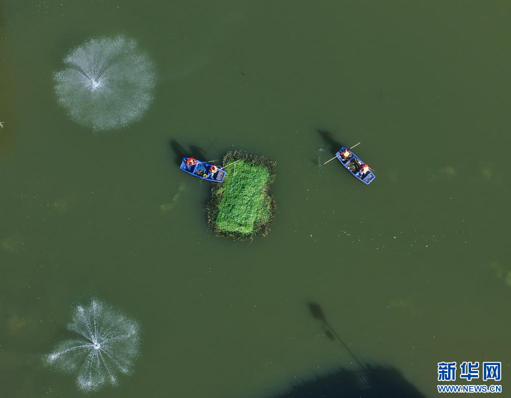 11月25日,和平镇长城村保洁人员乘船打捞水面漂浮物(无人机照片)。