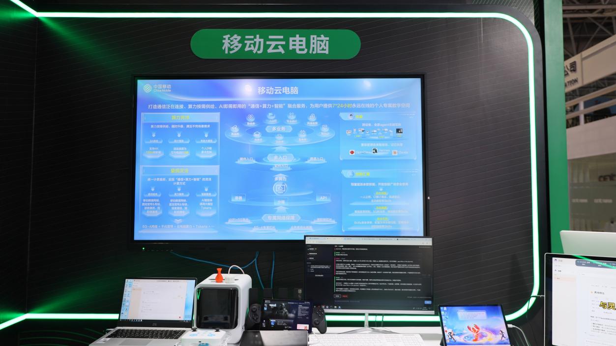 本届大会以数字技术创新与生活融合为核心方向,中国移动围绕澎湃算力、全域智能打造沉浸式体验展区,重点呈现依托移动云电脑运行的灵犀智能服务能力。灵犀智能体无实体硬件,作为纯云端智能应用搭载于移动云电脑之上,以稳定算力为底座,为用户带来可感知、可体验、可便捷使用的数智交互新感受。