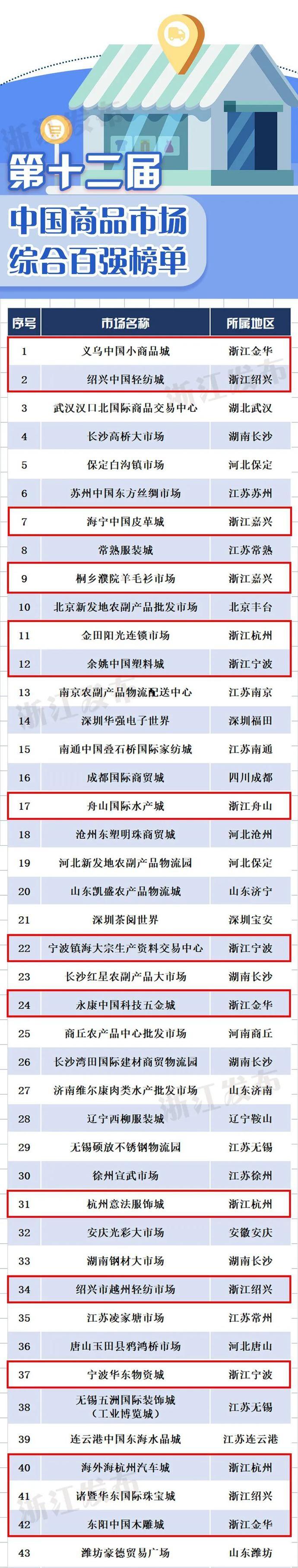市場峰會上,由中國社會科學(xué)評價(jià)研究院發(fā)布商品交易市場數(shù)字化創(chuàng)新發(fā)展報(bào)告及“中國商品市場綜合百強(qiáng)”榜單,百強(qiáng)中浙江占33席,在各省份中排列第一。