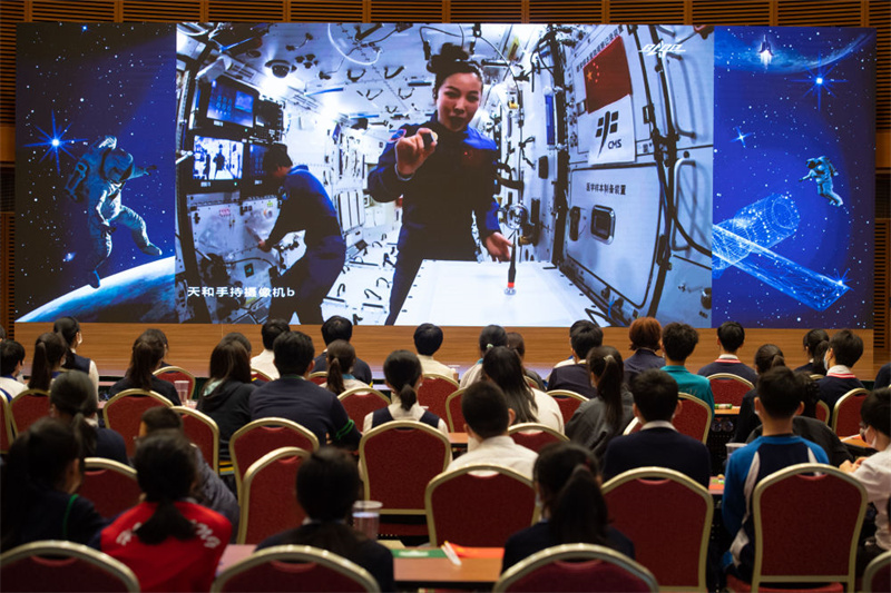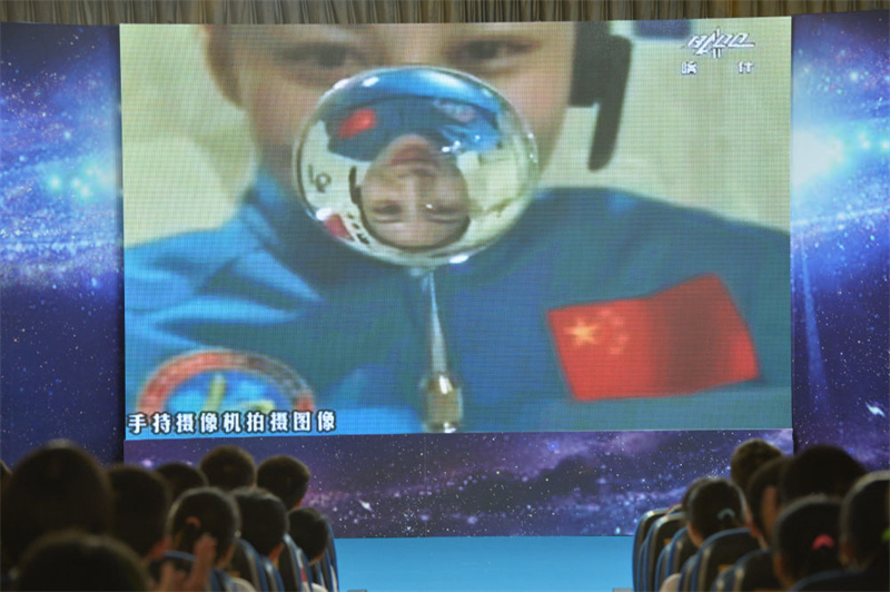 2021年12月9日,王亞平在太空課堂上。新華社記者 張金加 攝