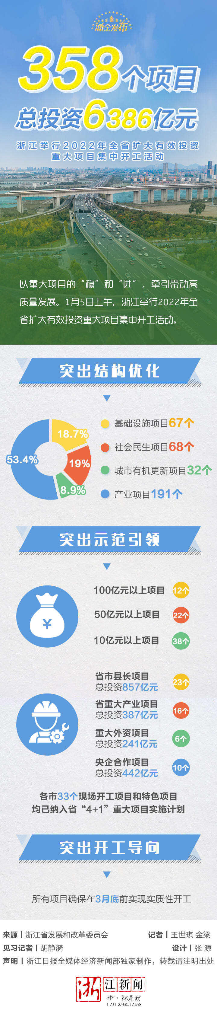 1月5日上午9時(shí)許,2022年全省擴(kuò)大有效投資重大項(xiàng)目集中開工活動(dòng)在浙江省人民大會(huì)堂舉行??偼顿Y達(dá)6386億元的358個(gè)重大項(xiàng)目正式啟動(dòng)開工,項(xiàng)目平均投資18億元,年度計(jì)劃投資921億元。