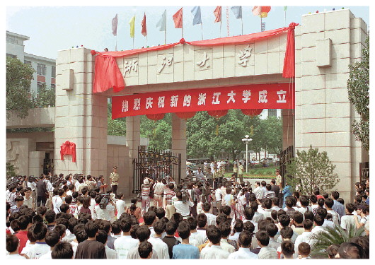 1998年9月15日,由原浙江大學(xué)、杭州大學(xué)、浙江農(nóng)業(yè)大學(xué)、浙江醫(yī)科大學(xué)合并組建而成的新浙江大學(xué)在杭州成立。(新華社記者王定昶攝)