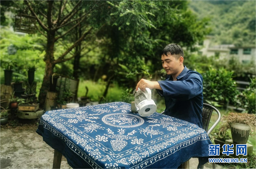 這張鋪著藍(lán)夾纈的小方桌就是“阿勇哥”吃飯、喝茶的地方,也是他拍攝美食的主要地點。