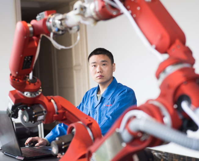 溫州瑞安市海尚集團(tuán)技術(shù)人員調(diào)試自主研發(fā)的雙臂協(xié)同機(jī)器人 新華社記者 翁忻旸 攝