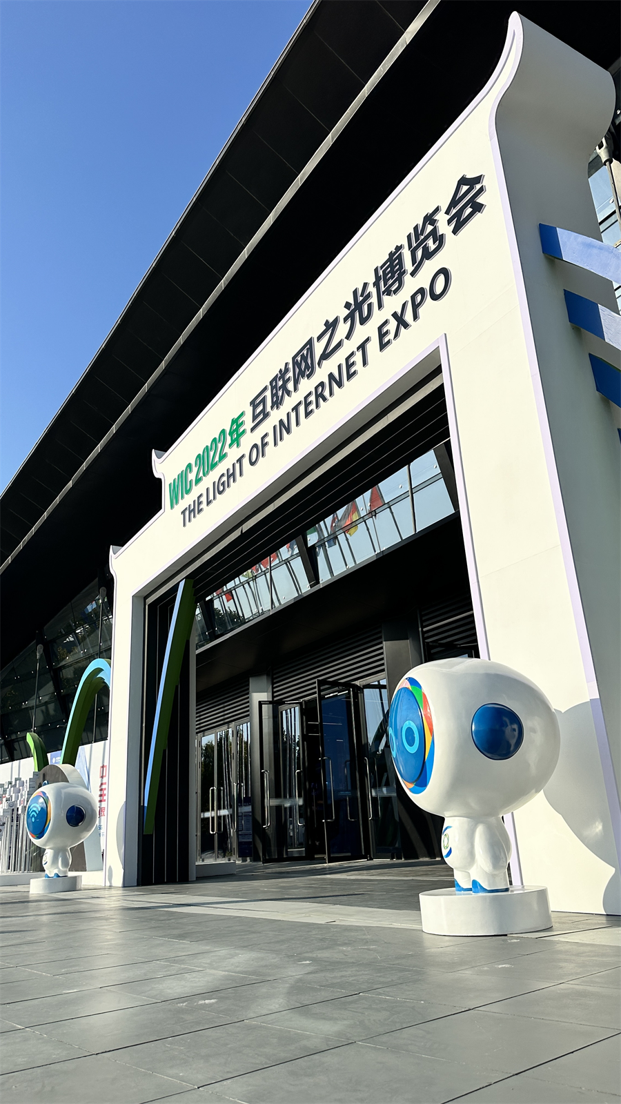 2022年互聯(lián)網(wǎng)之光博覽會(huì)場(chǎng)館外,兩側(cè)是本次烏鎮(zhèn)峰會(huì)全新亮相的世界互聯(lián)網(wǎng)大會(huì)互聯(lián)網(wǎng)之光博覽會(huì)吉祥物“小互”。新華網(wǎng)馬江 攝