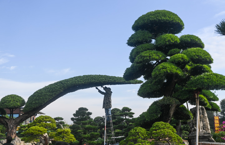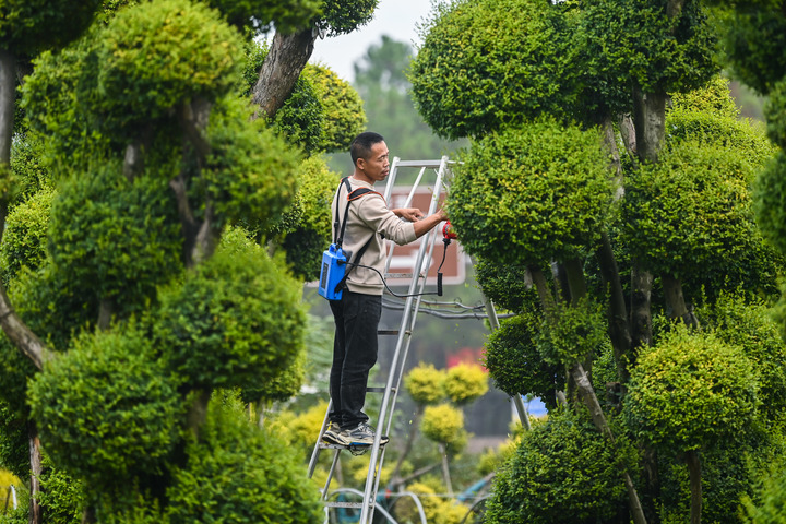 11月28日,在金華市金東區(qū)澧浦花木城的天越園藝苗圃內(nèi),種植戶在修剪樹木。新華社記者 徐昱 攝