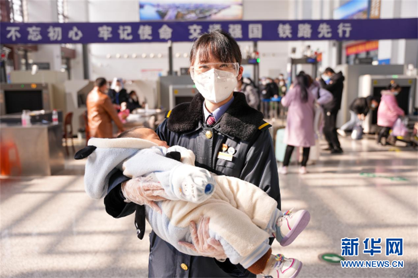 高鐵金華站“i浙里·和美金華”雷鋒服務站的工作人員幫助旅客安撫幼兒。新華網(wǎng)發(fā)