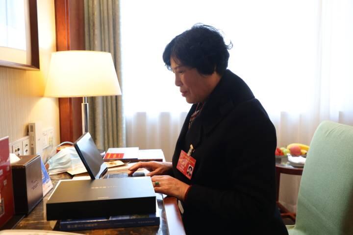省人大代表裘銀芳在駐地房間查看會(huì)議資料。浙江新聞客戶(hù)端記者 王建龍 攝