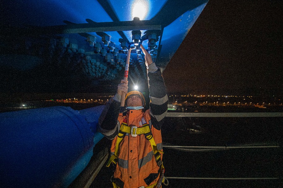 1月18日凌晨,鐵路工人在檢查杭臺高鐵椒江特大橋橋墩。