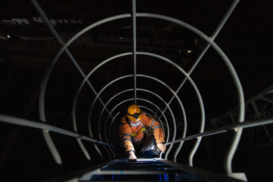1月17日夜,鐵路工人沿著檢修通道攀登上杭臺高鐵椒江特大橋橋面。