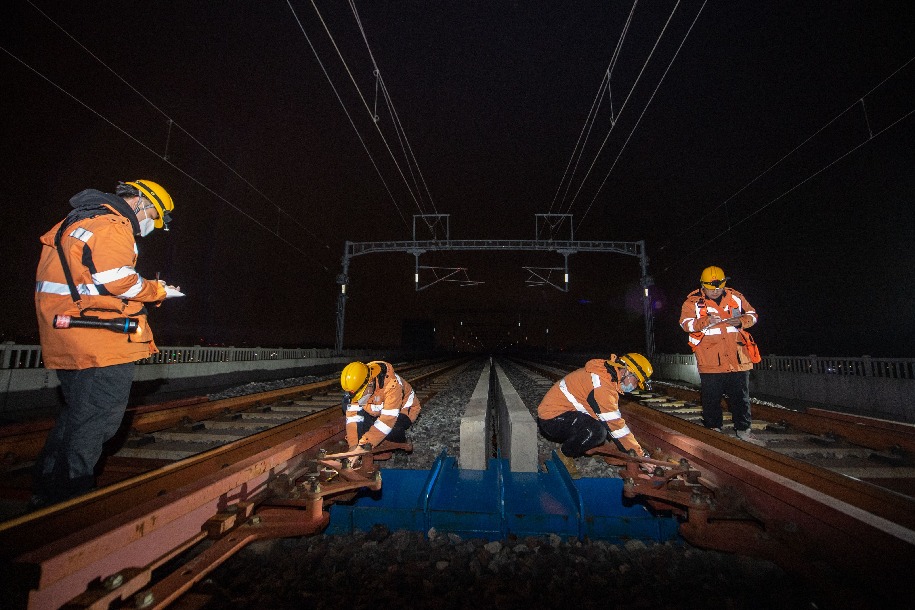 1月17日夜,鐵路工人對杭臺高鐵椒江特大橋進行檢查作業(yè)。