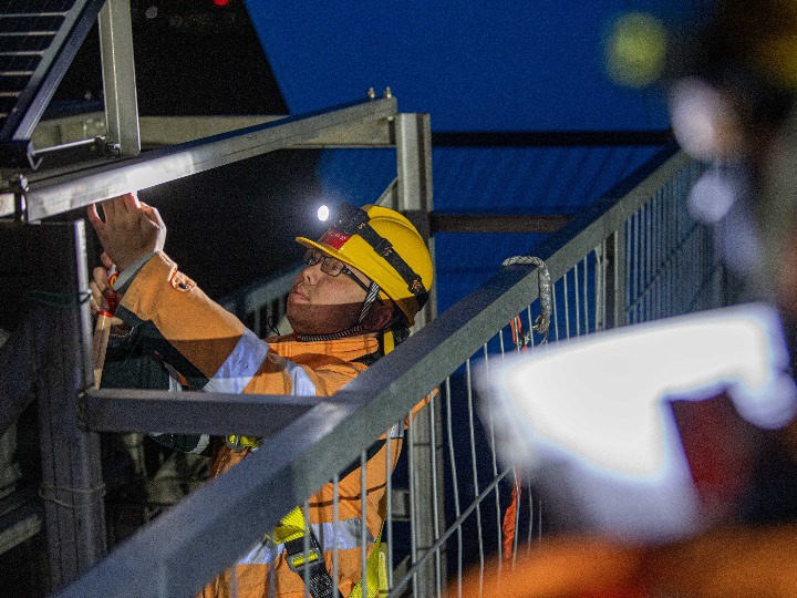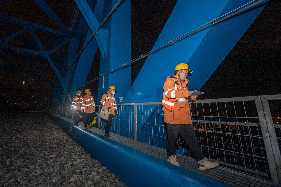 近日,浙江省迎來降溫天氣。鐵路寧波工務段椒江橋隧工區(qū)的工人們利用夜間高鐵線路的“天窗期”,頂著冬夜的寒風對杭臺高鐵椒江特大橋進行全方位檢查,確保線路安全。