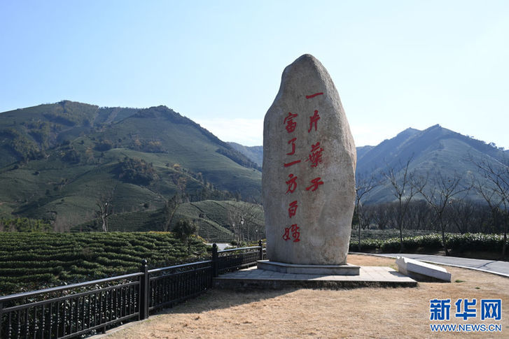 刻有“一片葉子富了一方百姓”字樣的石碑立在浙江省安吉縣黃杜村萬畝茶園邊(2月21日攝)。新華社記者 黃宗治 攝