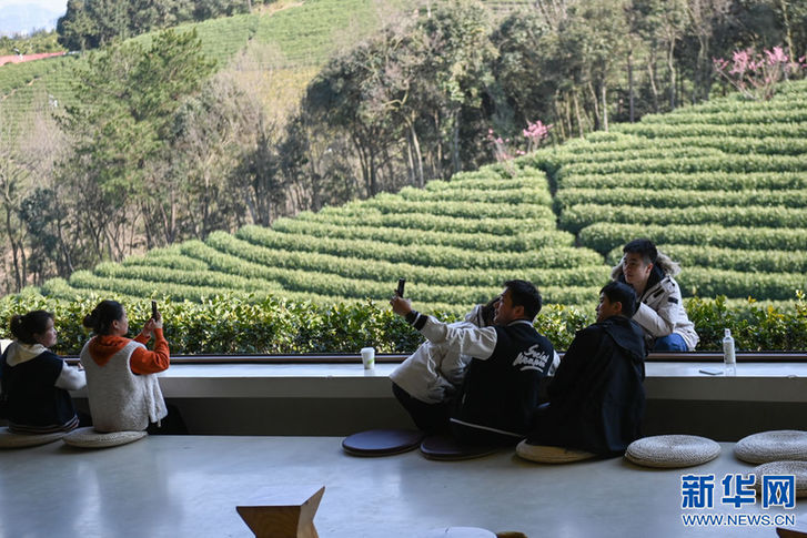 游客在浙江省安吉縣黃杜村萬畝茶園邊的咖啡館留影(2月21日攝)。新華社記者 黃宗治 攝