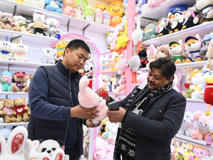 來自印度的客商拉賈(右)在義烏中國小商品城的一家玩具店鋪內(nèi)選購(2023年2月2日 新華社記者黃宗治攝)。