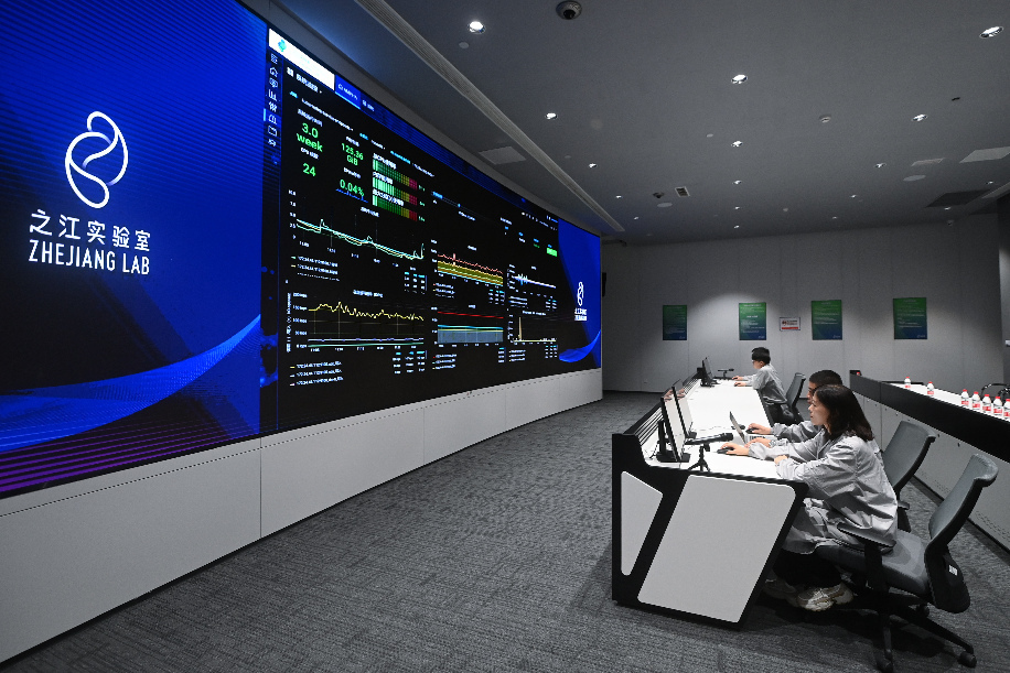 在位于杭州城西科創(chuàng)大走廊的之江實驗室計算與數(shù)據(jù)中心,工程師們通過“之江云”系統(tǒng)監(jiān)測服務(wù)器集群的運行狀態(tài)(2022年6月23日 新華社記者黃宗治攝)。