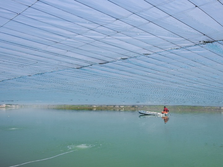 ↑3月2日,在位于湖州市吳興區(qū)東林鎮(zhèn)保健村的湖旺水產(chǎn)基地的恒溫池塘內(nèi),工作人員在查看池塘的水質(zhì)情況,為魚苗下一步進(jìn)入池塘培育做準(zhǔn)備。