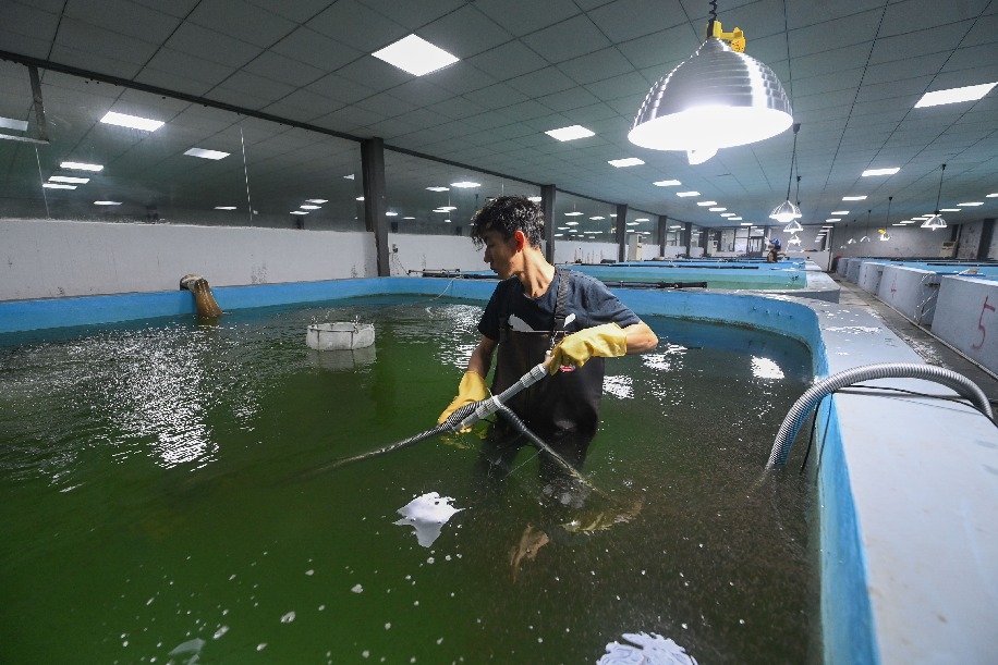 ↑3月2日,在位于湖州市吳興區(qū)東林鎮(zhèn)保健村的湖旺水產(chǎn)基地的恒溫繁育車間內(nèi),工作人員在進(jìn)行人工吸污并查看水池中鱸魚魚苗的生長情況。該水產(chǎn)基地460畝育苗池塘配套著恒溫設(shè)備,數(shù)字化繁育車間每日能孵化出2000萬尾魚苗,供給周邊的漁業(yè)養(yǎng)殖戶。