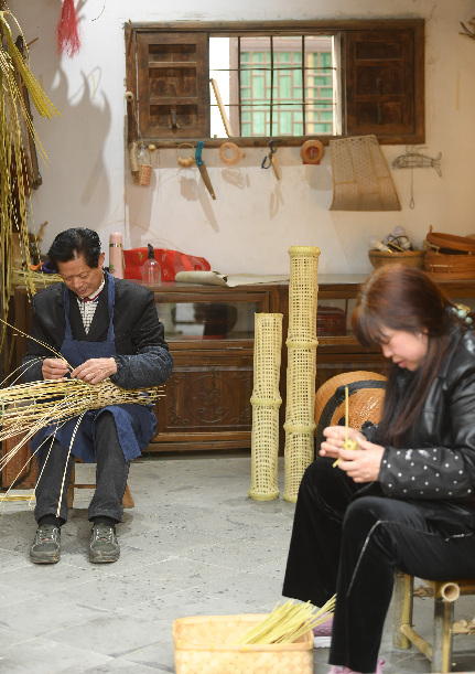 4月3日,村里的篾匠和農(nóng)戶在姜鵬的工作室里編制竹制品。