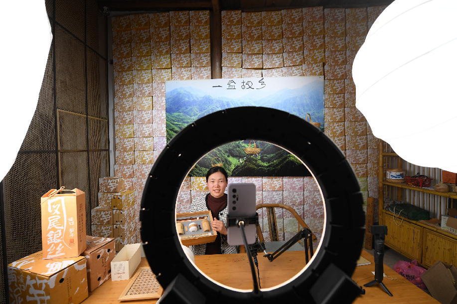 4月3日,鄒霞在直播間介紹一款由當(dāng)?shù)攸S茶、紅木筷子、皮紙和手工竹編結(jié)合的產(chǎn)品。