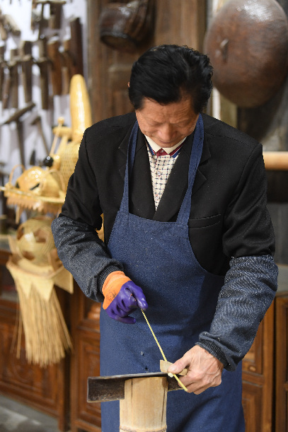 4月3日,篾匠徐明光在姜鵬的工作室削篾條。作為村里有名的老篾匠,他在這里找到了這門手藝的新方向。