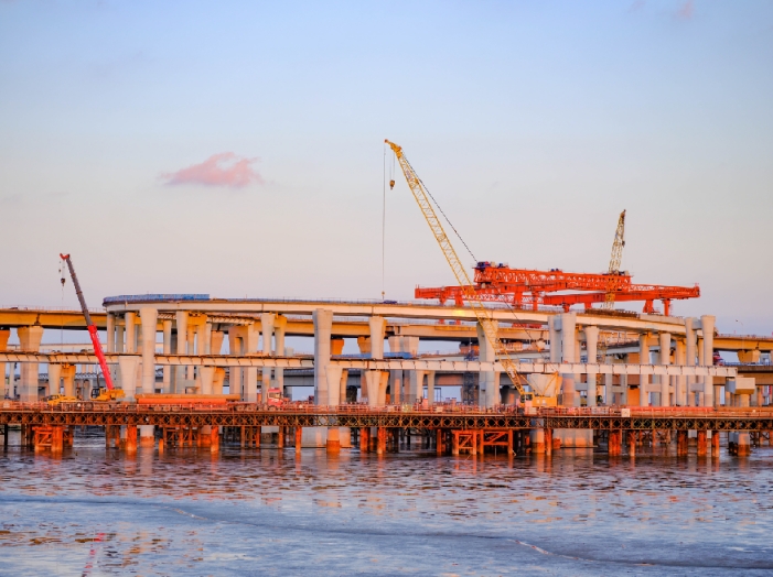 茫茫東海之濱,在車水馬龍、川流不息的甬舟高速金塘大橋兩側(cè),亞洲最大的海上互通——杭甬復(fù)線寧波一期項(xiàng)目濱?;ネǖ氖┕がF(xiàn)場一片熱火朝天的繁忙景象?!艾F(xiàn)階段,項(xiàng)目指揮部牽頭通過采用架橋機(jī)架梁、履帶吊架梁等多種工藝方案進(jìn)行鋼混組合梁施工,同時(shí)繼續(xù)加大施工人員、模板和機(jī)械設(shè)備等方面的資源投入,實(shí)現(xiàn)多點(diǎn)開花、全力提速。目前,互通5條匝道同時(shí)開展架梁作業(yè),鋼混組合梁架設(shè)任務(wù)已完成46.8%,這個(gè)占地613畝的亞洲海上最大互通已初具雛形?!闭憬煌瘓F(tuán)杭甬復(fù)線寧波一期項(xiàng)目相關(guān)負(fù)責(zé)人介紹道。