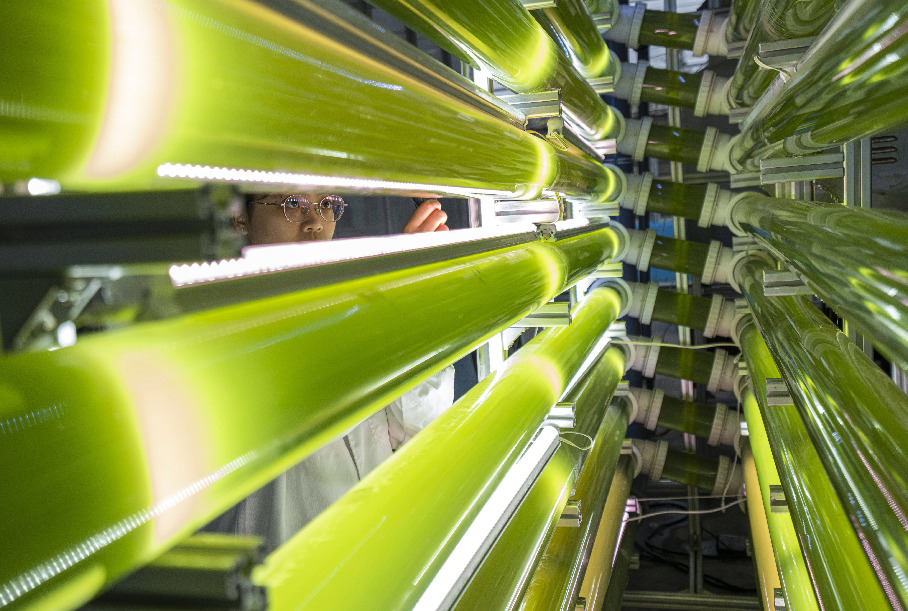 4月7日,在位于浙江省溫州市龍灣區(qū)圍墾南片的永興對(duì)蝦“未來(lái)漁場(chǎng)”,技術(shù)人員在藻類(lèi)連續(xù)培養(yǎng)系統(tǒng)前測(cè)量光照強(qiáng)度。新華社發(fā)(蘇巧將 攝)