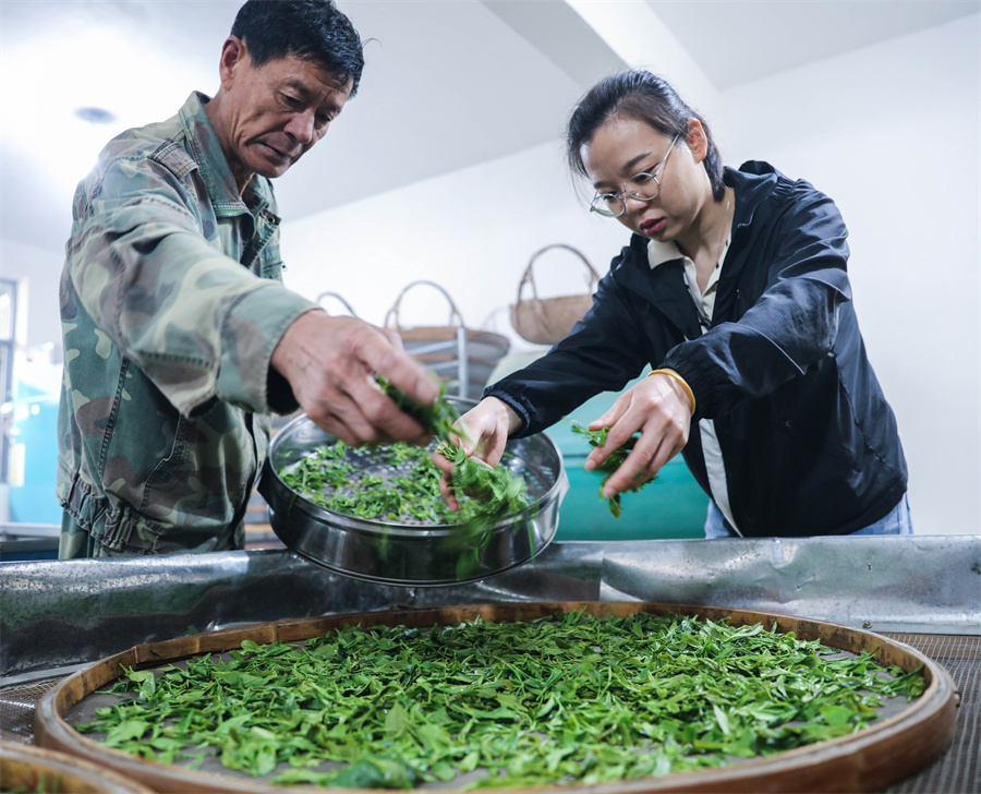 ↑5月6日,湖州市長(zhǎng)興縣煤山鎮(zhèn)五通山村羅岕茶種植區(qū)的茶農(nóng)將制作好的羅岕茶進(jìn)行攤涼。