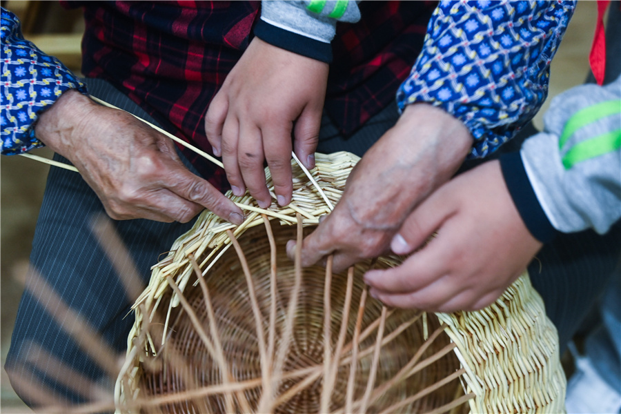 5月9日,東林鎮(zhèn)第二小學的學生向柳編藝人學習柳編技藝。