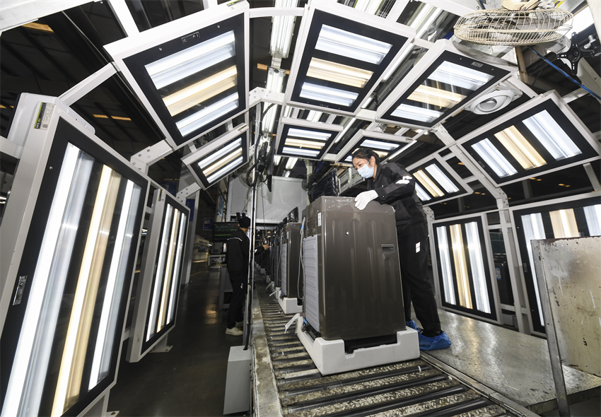 工人在重慶海爾洗衣機(jī)有限公司生產(chǎn)車間檢測產(chǎn)品質(zhì)量。新華社記者王全超攝