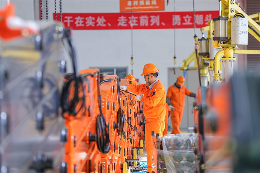 1月29日,在浙江省湖州市德清縣雷甸鎮(zhèn)浙江鼎力機(jī)械股份有限公司大型高空作業(yè)機(jī)械未來工廠,工人加緊趕制出口的新臂式智能高空作業(yè)平臺設(shè)備。新華社發(fā)(蔡俊 攝)