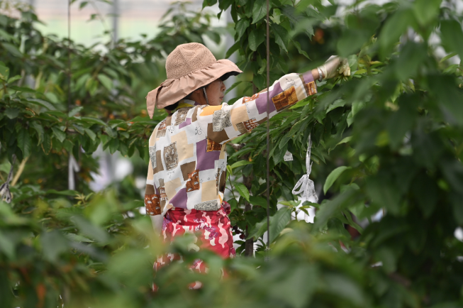 5月14日,農(nóng)戶在桐廬縣莪山畬族鄉(xiāng)塘聯(lián)村“水果共富工坊”內(nèi)對(duì)大櫻桃進(jìn)行修枝養(yǎng)護(hù)。新華社記者 黃宗治 攝
