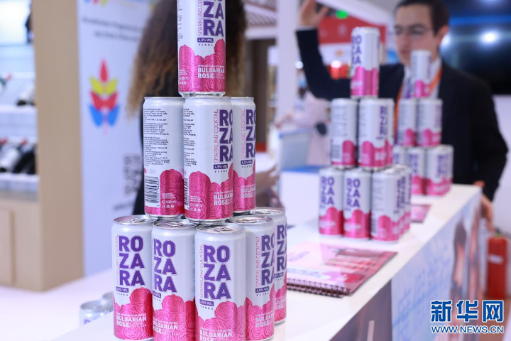 在中東歐特色商品展區(qū),保加利亞展示了新品玫瑰氣泡雞尾酒。新華網(wǎng) 張靈 攝