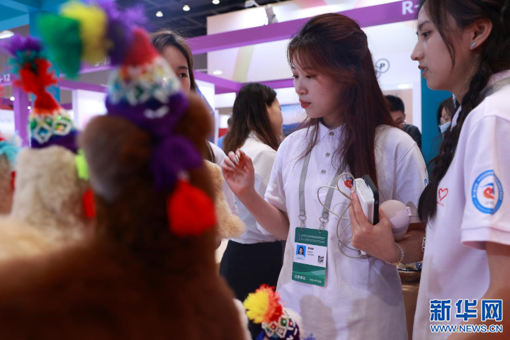 在中東歐特色商品展區(qū)日用消費品區(qū)域,由羊駝毛制作的羊駝玩偶吸引了許多女性的目光。新華網(wǎng) 張靈 攝