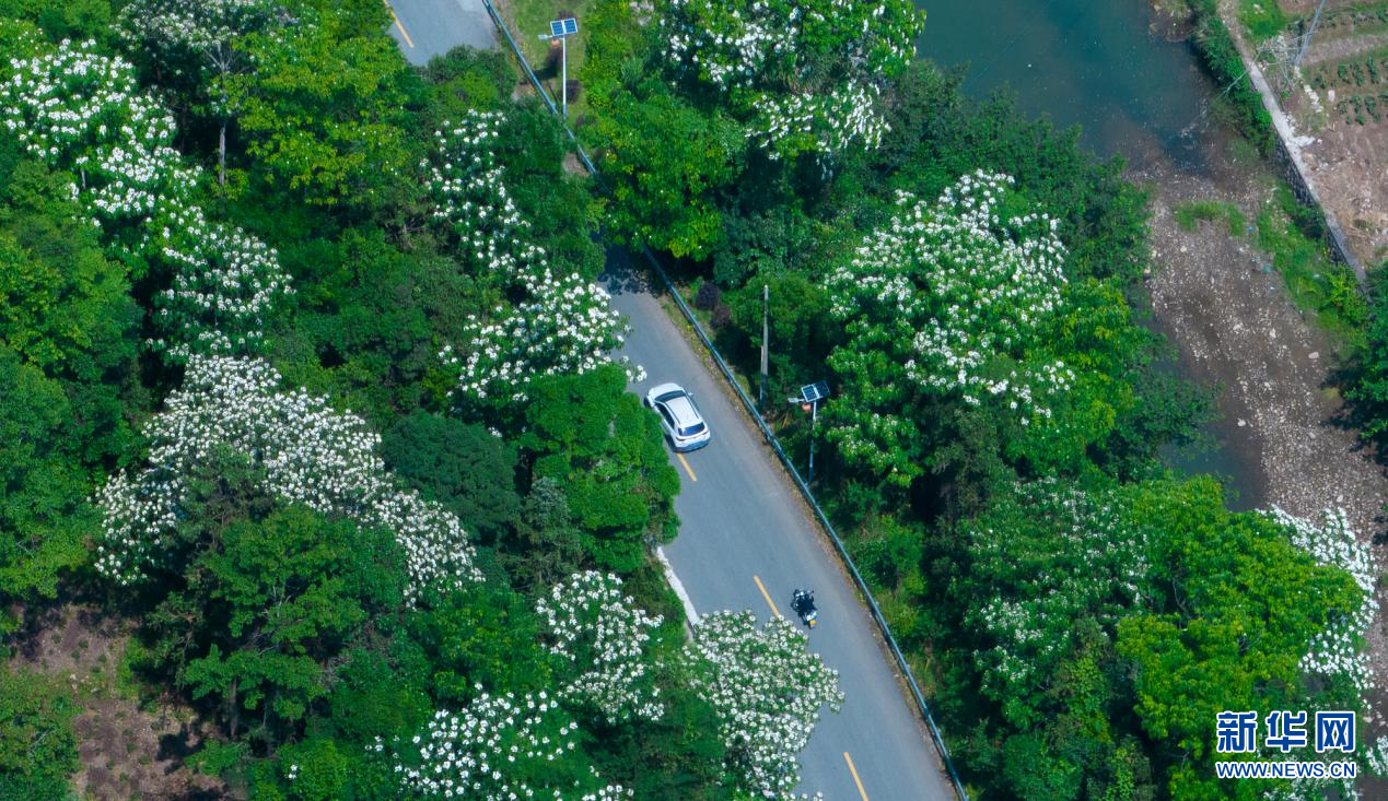 初夏時節(jié),浙江省溫州市文成縣各地油桐花競相開放,紛飛似雪。在文成縣蜿蜒的山間道路上,一簇簇雪白的花朵布滿山林枝頭,遠遠眺望宛如冬之薄雪。清風拂過山崖,花朵飄落滿地,香氣彌漫、仙氣飄飄,占盡初夏風流。(王健)