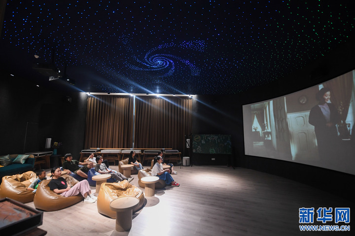 居民在位于浙江省杭州市富陽區(qū)銀湖街道硅谷社區(qū)的“合之舍”書房的影視廳觀看電影,該書房是銀湖街道“15分鐘品質(zhì)文化生活圈”的示范點(diǎn)位(2022年7月2日攝)。新華社記者 徐昱 攝