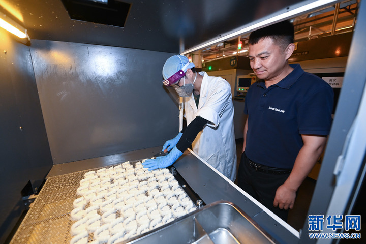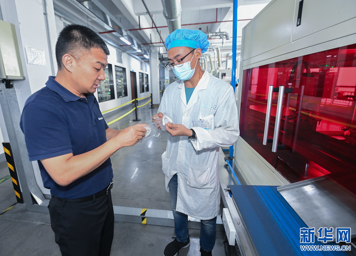 5月31日,浙江正雅齒科股份有限公司董事長(zhǎng)姚峻峰(右)在位于嘉興南湖高新區(qū)的公司車間內(nèi)查看生產(chǎn)線上的個(gè)性化定制式隱形正畸矯治器。姚峻峰是畢業(yè)于英國(guó)赫爾大學(xué)的工商管理碩士,回國(guó)后創(chuàng)辦了正雅齒科公司。新華社記者 徐昱 攝