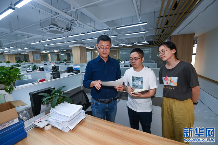 5月31日,在位于嘉興南湖高新區(qū)內(nèi)的嘉興允英醫(yī)學(xué)檢驗(yàn)有限公司內(nèi),張道允博士(左一)正在帶領(lǐng)工作人員一起查看數(shù)據(jù)資料。張道允曾經(jīng)先后就讀于中科院以及美國(guó)約翰·霍普金斯大學(xué)醫(yī)學(xué)院,是腫瘤生物學(xué)研究領(lǐng)域的專家。新華社記者 徐昱 攝