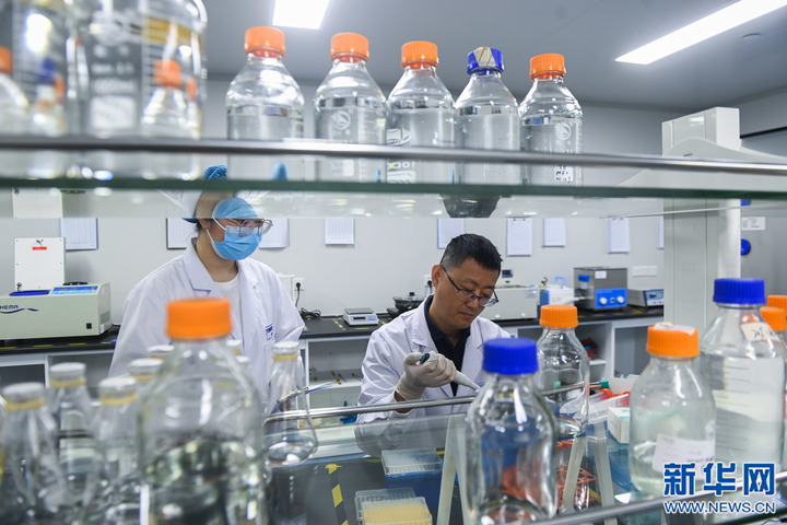 5月31日,在位于嘉興南湖高新區(qū)內(nèi)的嘉興允英醫(yī)學(xué)檢驗(yàn)有限公司實(shí)驗(yàn)室內(nèi),張道允博士(右)正在帶領(lǐng)工作人員一起做實(shí)驗(yàn)。張道允曾經(jīng)先后就讀于中科院以及美國(guó)約翰·霍普金斯大學(xué)醫(yī)學(xué)院,是腫瘤生物學(xué)研究領(lǐng)域的專家。新華社記者 徐昱 攝