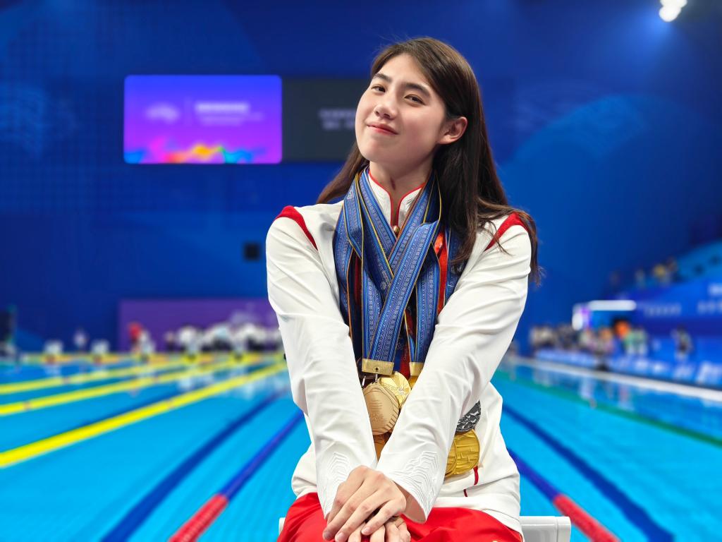 张雨霏戴着世锦赛、大运会、亚运会三项大赛奖牌在赛场留影。